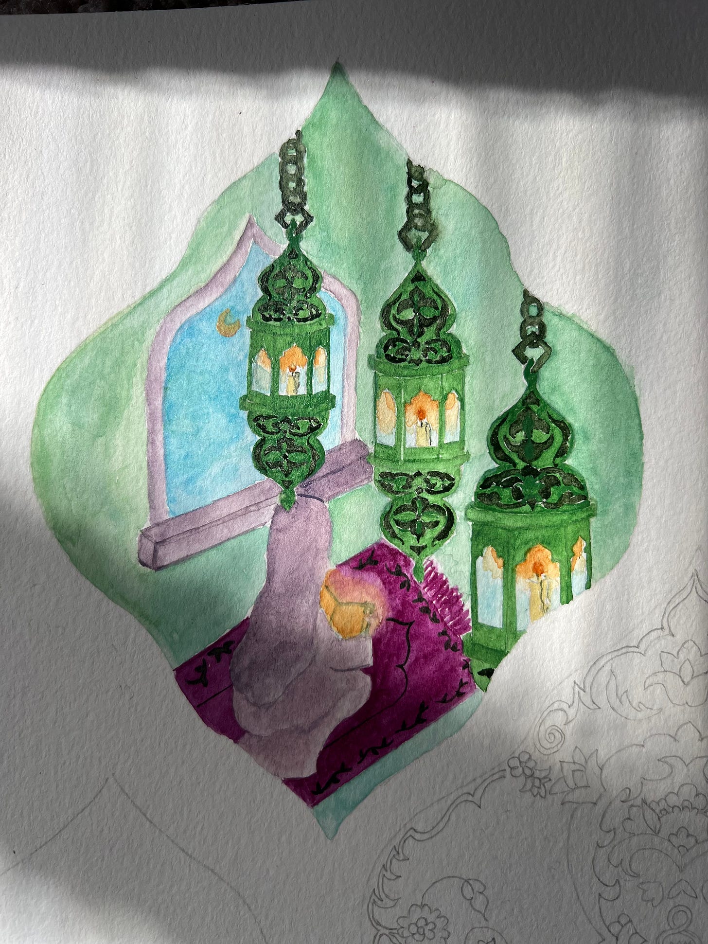 The pointed arch window, a classic element of Islamic architecture, frames a glowing moon. But I wanted the light of the Quran in the person’s hands to shine even brighter—a reminder that the real guiding light in our lives comes from the words of Allah.